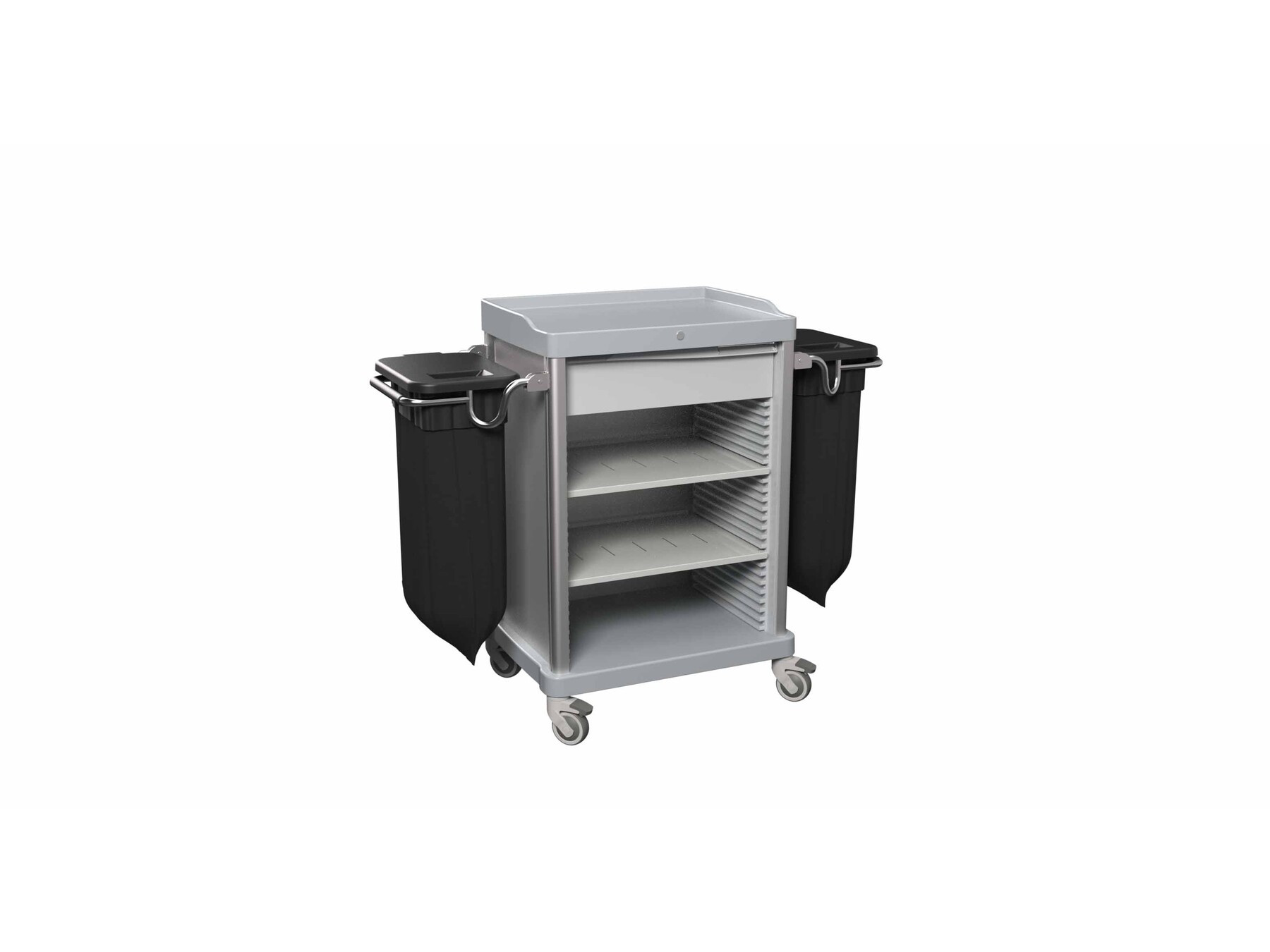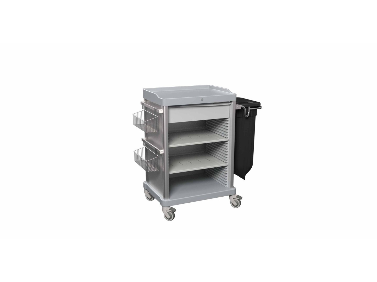 Zimmerservicewagen 119 x 57 x 110 cm, QUATRO, Offene Front, 1 Sackhalterung, 2 Gitterkörbe, 1 Schublade
